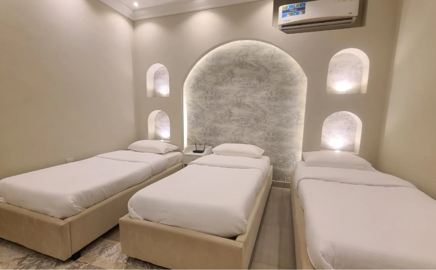 • غرفة تحتوي على 3 أسرّة مفردة مع حمام خاص